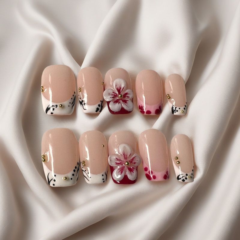 The overall style is both elegant and unique, making it perfect for everyday chic as well as formal occasions. Whether you love classic French eleganceor romantic floral elements this nail set beautifully showcases refined fingertip aesthetics.